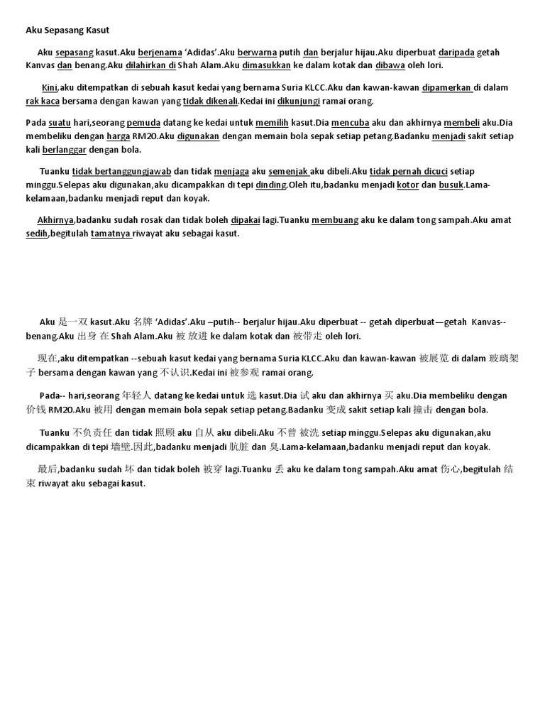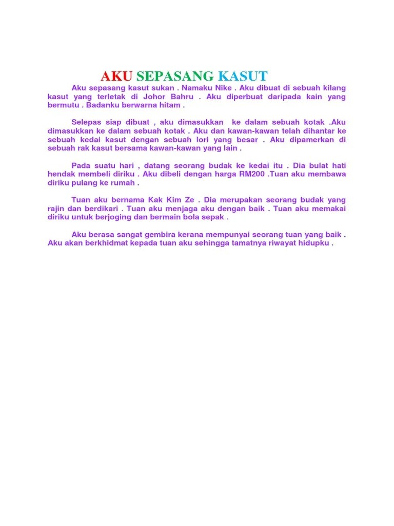 Oleh sebap itu,aku sedia berhadapan dengan . You can do the exercises online or download the worksheet as pdf. • 1 like • 444 views. Aku sepasang kasut bola sepak. Tulis karangan tentang perjalanan hidup kamu selengkapnya. Aku sepasang kasut sekolah.aku berjenama 'pallas' aku dibuat di sebuah kilang yang terletak di putrajaya.aku diperbuat daripada kulit dan .